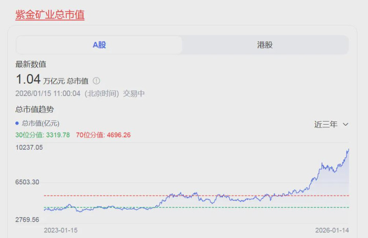 自去年年末以来,紫金矿业股价持续走高,截至14日收盘,其近20个交易日累计上涨近21%。受连日攀升提振,紫金矿业的市值规模不断上升,以收盘数据统计,其13日首次站上万亿元市值关口,总市值达1.02万亿元,成为“万亿俱乐部”中的一员。