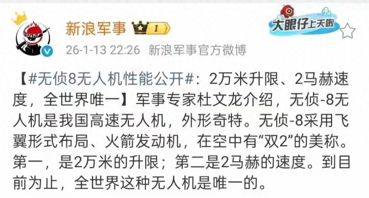 最近中国央视公开聊起了无侦-8的性能数据,专家杜文龙说它升限20000米,速度2马赫。数据一出中盛投资,立马引发了军事圈热议。不少人心存疑虑:一款采用大后掠角箭形气动、高速气动布局、还用上火箭发动机的无人侦察机,为啥指标只相当于常规喷气飞机水平?按照常识和外形设计,这样的数据其实说不过去。