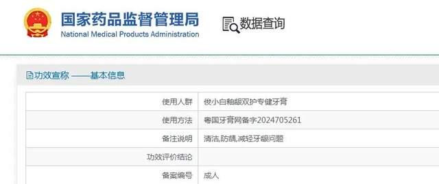 据报道,俊小白在网络上以“修护牙釉质再矿化”为卖点,但国家药监局备案显示,该款牙膏的功效宣称仅为“抗牙本质敏感,清洁”。人体功效评价试验简述亦仅围绕“抗敏感”展开,除产品名称外,无任何“修护”“护釉”类描述。